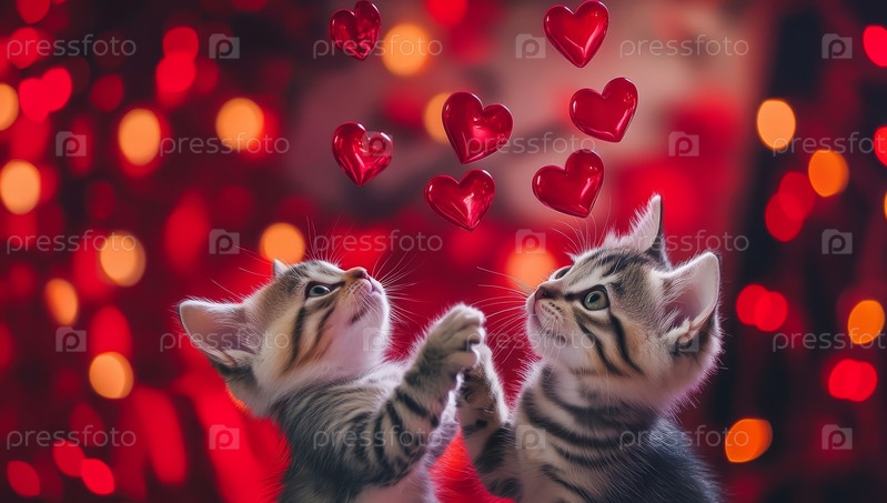 Два пушистых котенка смотрят на висящие сердечки, окруженные красными огнями боке, в очаровательной романтической сцене, идеально подходящей для тематики Дня святого Валентина