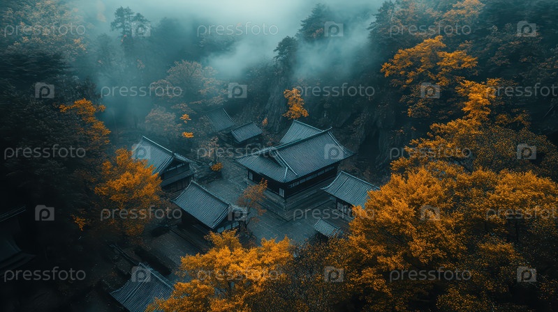 Традиционный японский храм в туманном лесу