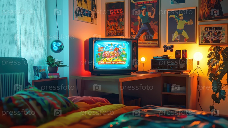 Ретро-спальня с винтажным телевизором и постерами