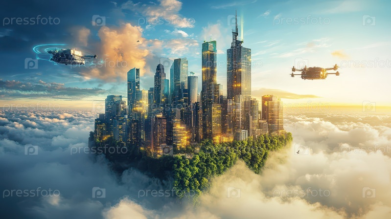 Футуристический плавучий город над облаками