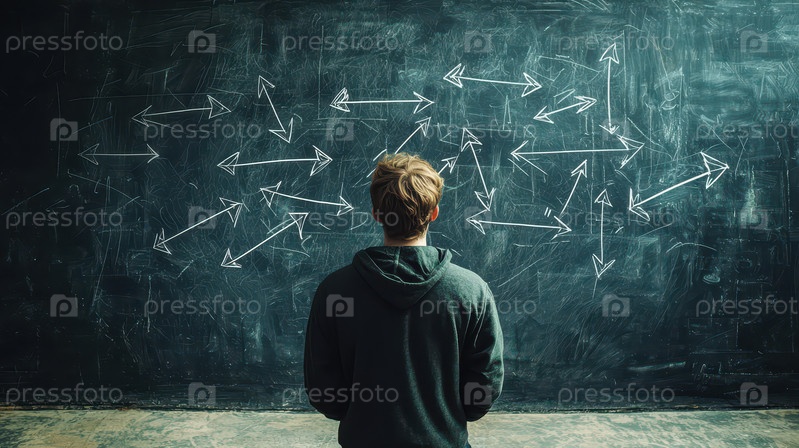 Мужчина стоит перед доской с несколькими стрелками, указывающими варианты выбора