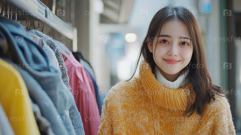 Молодая женщина улыбается в уютном свитере в магазине одежды