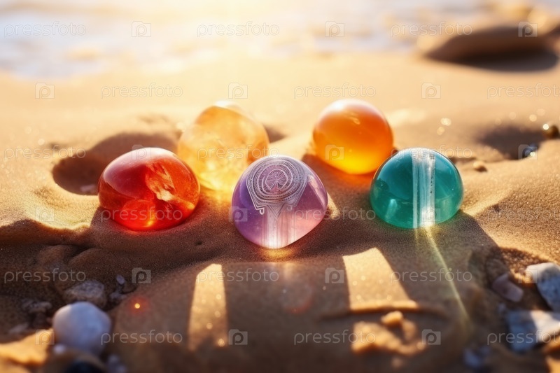 Яркие, красочные стеклянные драгоценные камни сверкают на солнце на песчаном пляже с видом на океан