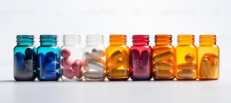 В концепции здравоохранения красочная бутылка с лекарством стоит изолированно на белом фоне, демонстрируя яркие зеленые, синие и оранжевые цвета таблеток, олицетворяя науку, лежащую в основе