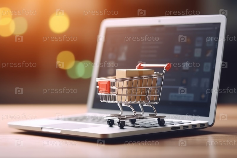 Виртуальное путешествие в розницу. Ноутбук, тележка, упаковочные коробки воплощают концепцию онлайн-покупок и доставки