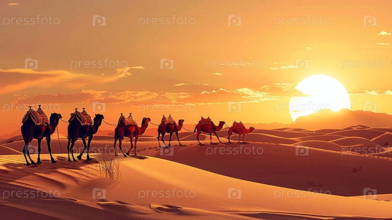 Процессия караванов, пересекающих бескрайнее пустынное море на закате