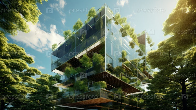 Высокое здание с живописным видом на деревья на переднем плане. Идеально подходит для любителей архитектуры или природы, ищущих уникальный городской пейзаж