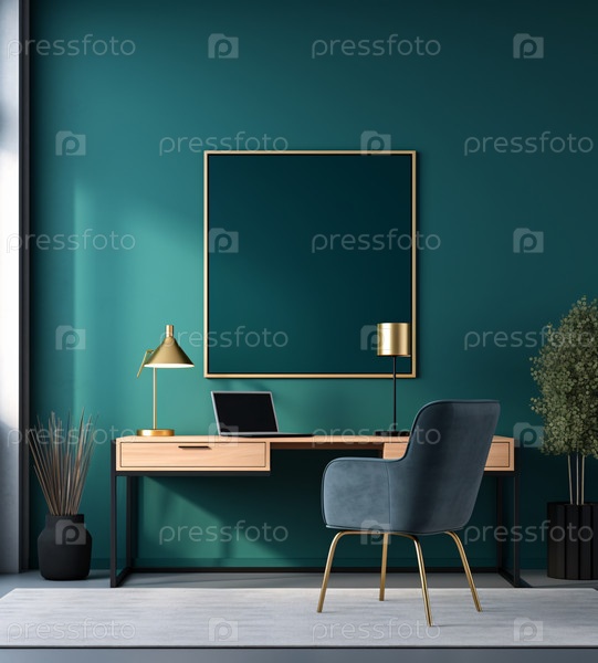 Минималистичный и комфортный интерьер домашнего рабочего пространства с деревянной мебелью, местом для копирования для монтажа на деревянном столе и пустой рамкой на белой стене