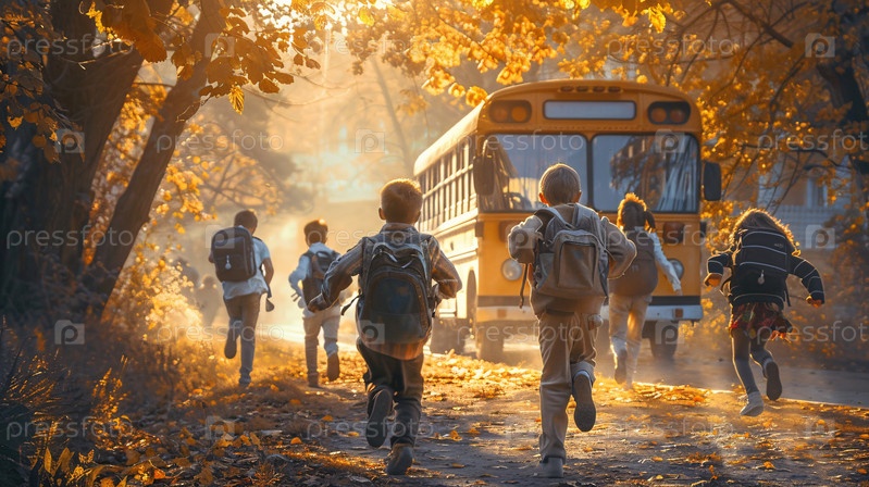 Дети бегут к школьному автобусу осенним утром с рюкзаками