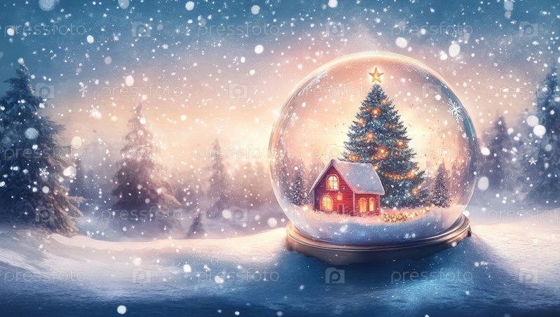 Зимняя страна чудес со снежным шаром, домиком и вечнозелеными деревьями