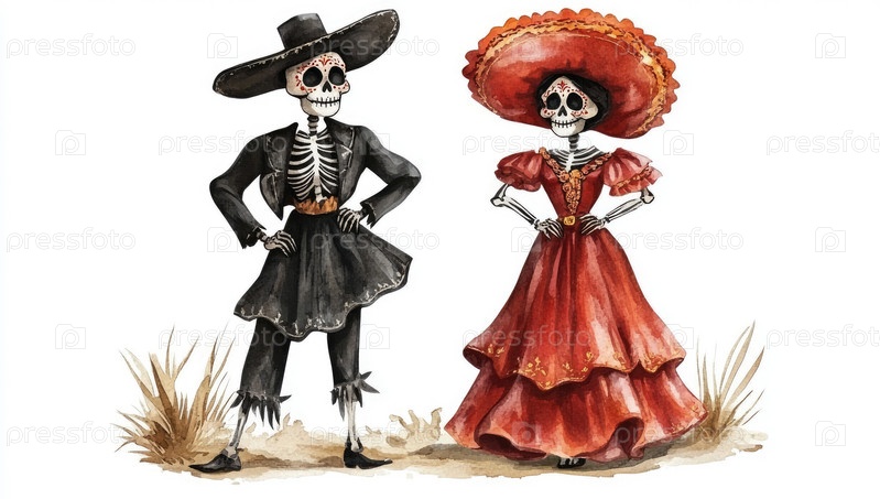 Традиционный мексиканский праздник Дня мертвых, изображенный в ярких акварелях