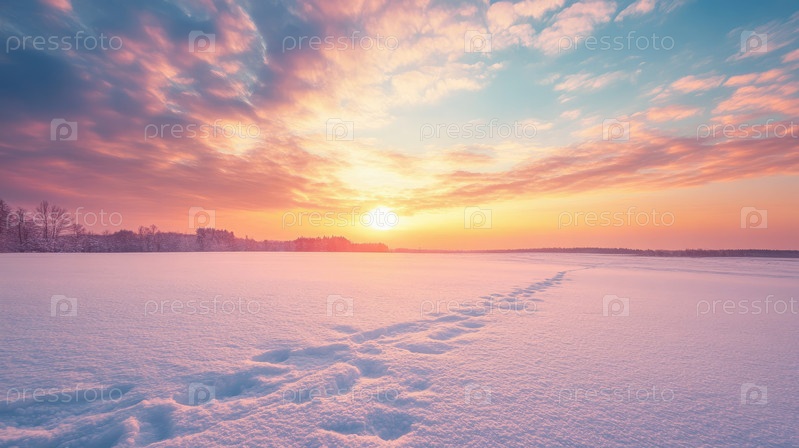 Захватывающий восход солнца освещает огромное, мирное заснеженное поле с деревьями, покрытыми инеем, и чистым голубым небом
