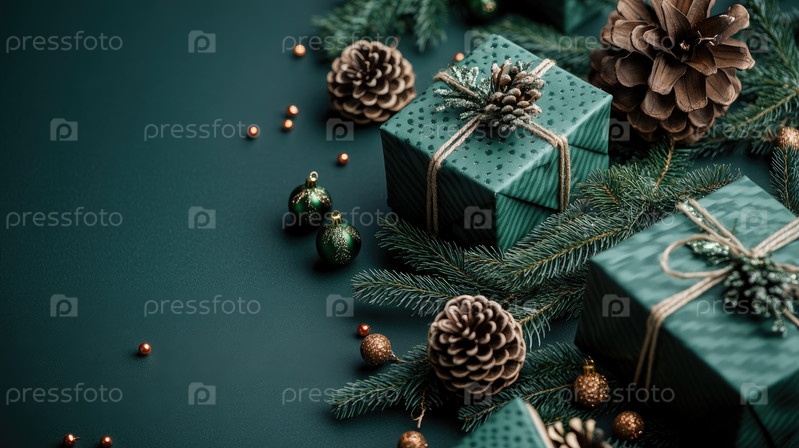 Красиво упакованные зеленые подарки, украшенные шишками и еловыми ветками, лежат на темном фоне, олицетворяя экологически чистый праздничный дух