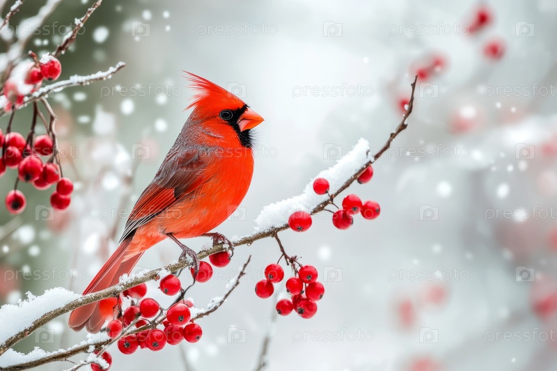 Яркий красный кардинал грациозно восседает на заснеженной ветке, окруженный мирным зимним пейзажем