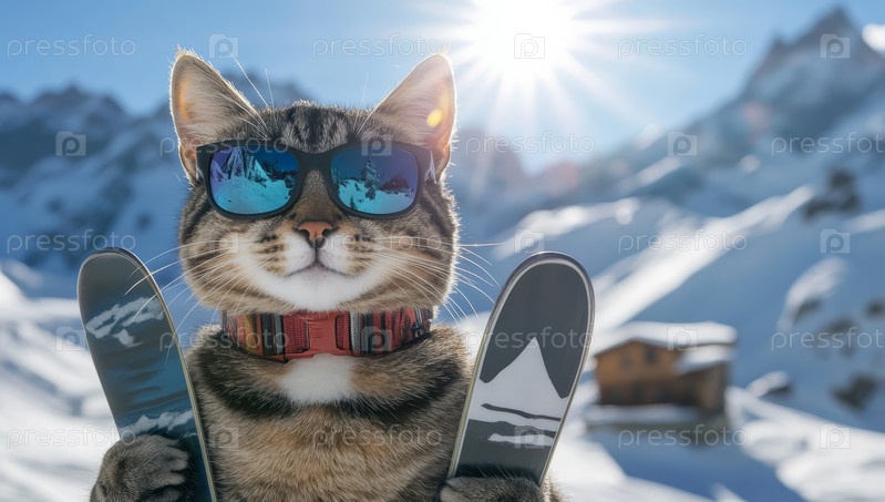 Милый кот готов к зимним приключениям, держа в руках мини-лыжи под солнечным небом