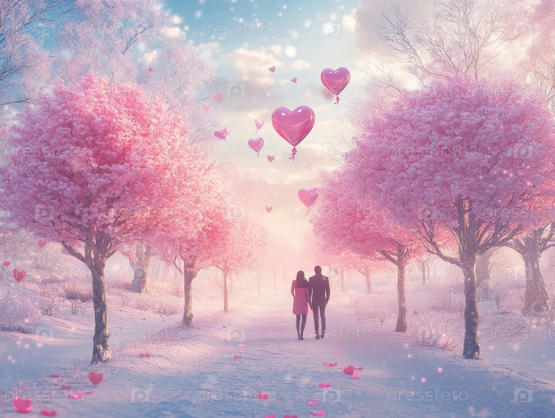 Пара идет рука об руку по заснеженной тропинке в окружении розовых цветущих деревьев и воздушных шаров в форме сердец, создавая романтическую и сказочную зимнюю сцену