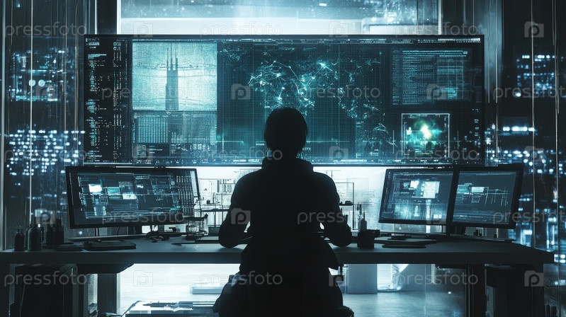 На этом изображении изображен одинокий киберпанк-хакер, работающий до поздней ночи в темной футуристической среде, окруженный несколькими компьютерными мониторами, отображающими сложные потоки данных и код