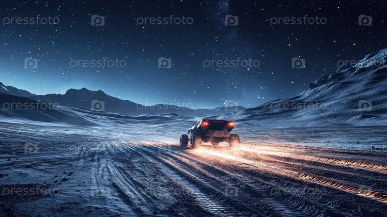Высокотехнологичный внедорожник мчится по пересеченной местности под звездным небом, оставляя светящиеся следы шин