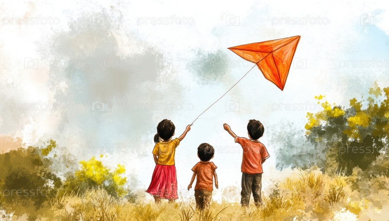 Счастливые дети запускают воздушного змея в акварельном стиле