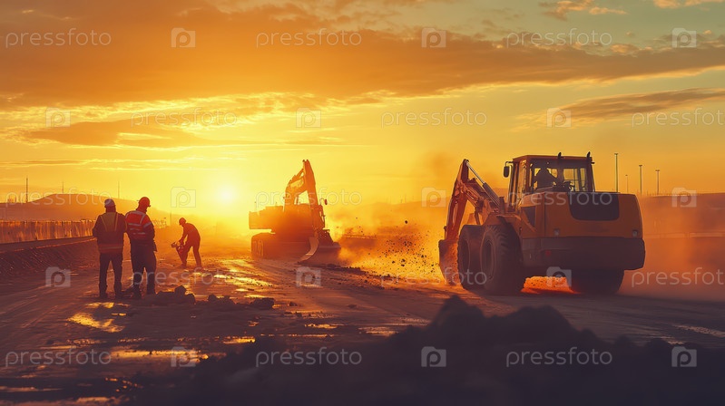 Строительство дороги Sunset с экскаваторами и рабочими
