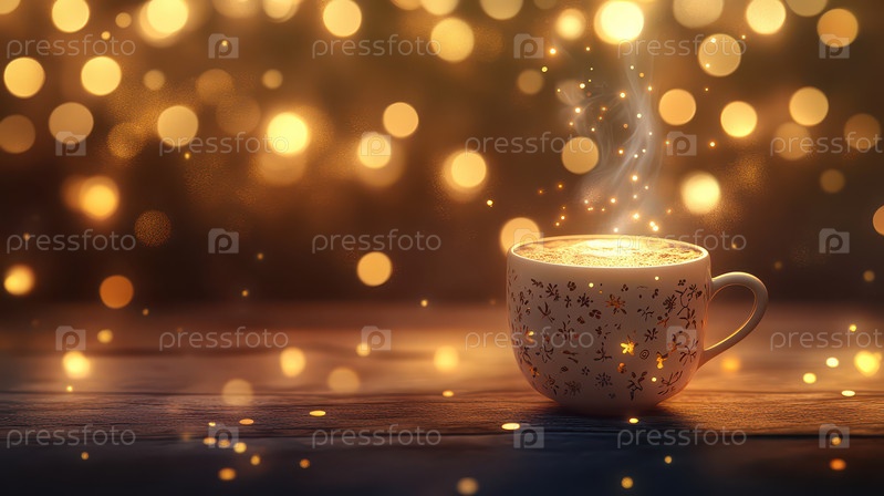 Уютная чашка кофе с теплыми золотистыми огнями боке