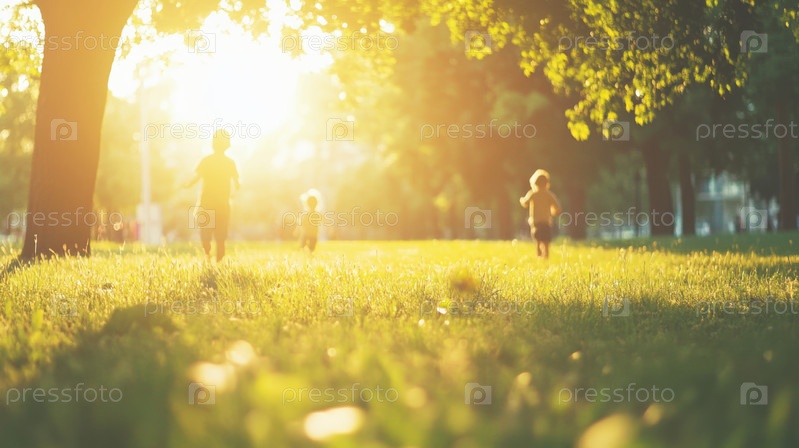 Дети бегут по залитому солнцем лесу в летнем блаженстве