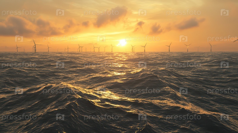 Ветряные турбины на закате над спокойными водами океана