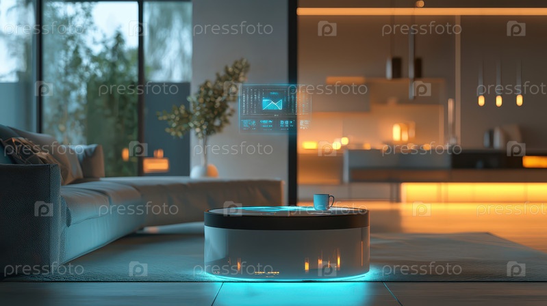 Современная гостиная с голографическим интерфейсом и интеллектуальными технологиями