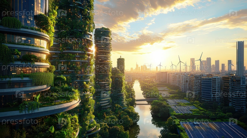 Футуристический зеленый город с вертикальными садами и ветряными турбинами