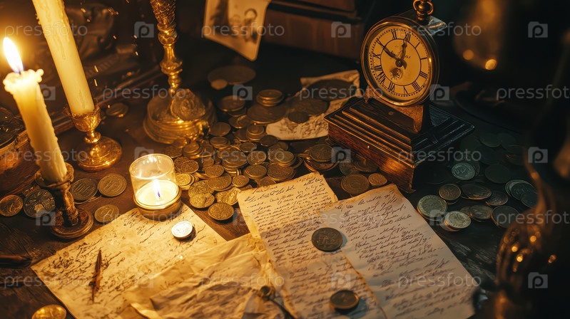 Старинные монеты, часы и письма на деревянном столе