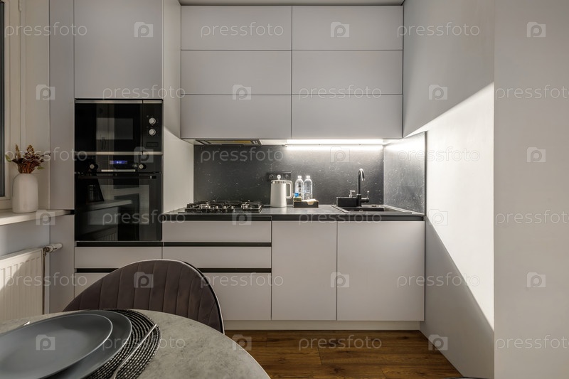 Минималистская кухня с современной техникой, гладкой черной столешницей и чистыми линиями, создающими современный образ