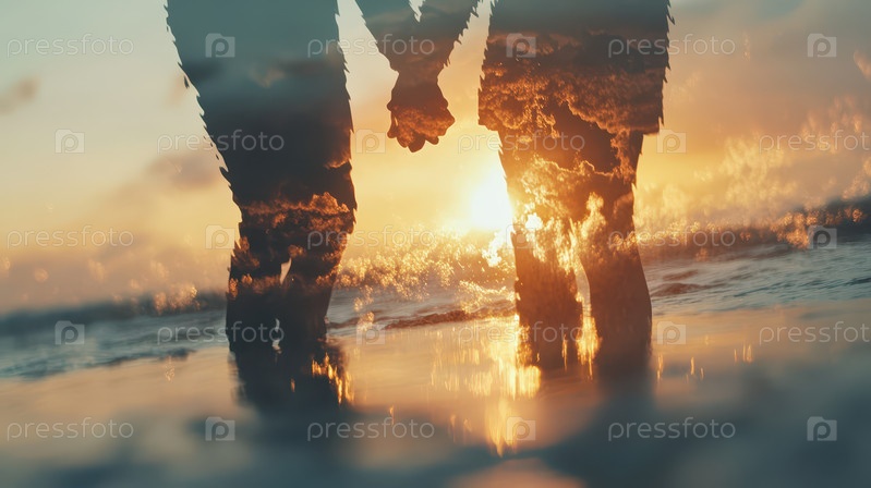 Пара держится за руки на закате с двойной экспозицией