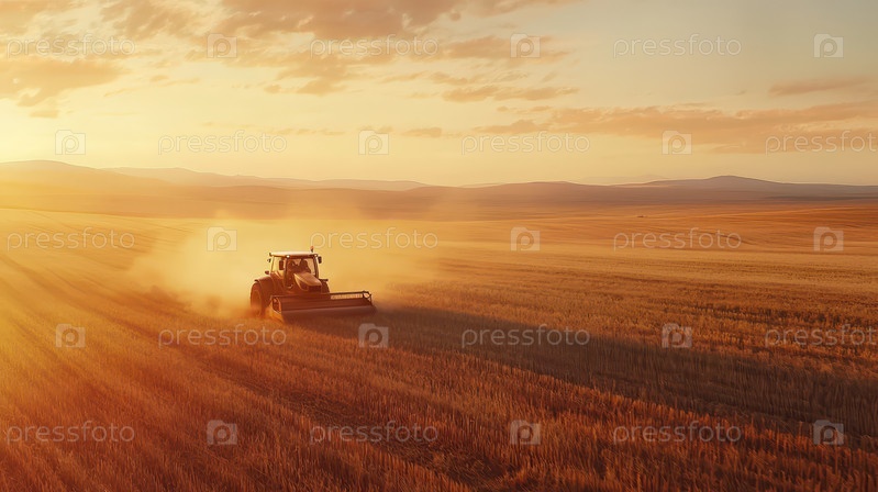Трактор убирает урожай пшеницы на закате