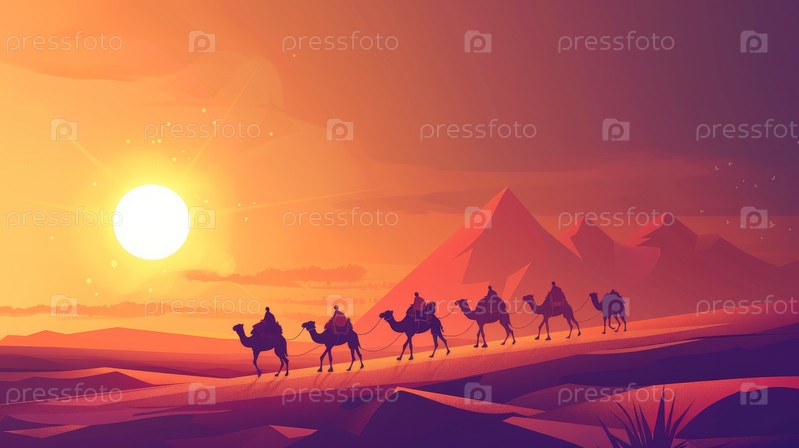 Процессия караванов, пересекающих бескрайнее пустынное море на закате