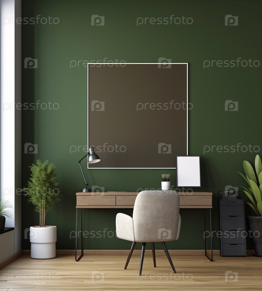 Минималистичный и комфортный интерьер домашнего рабочего пространства с деревянной мебелью, местом для копирования для монтажа на деревянном столе и пустой рамкой на белой стене