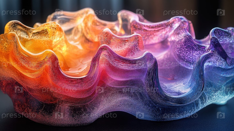 Потрясающая стеклянная скульптура с плавными, органическими формами и ярким градиентом теплых и холодных цветов, отражающая художественное мастерство и креативность