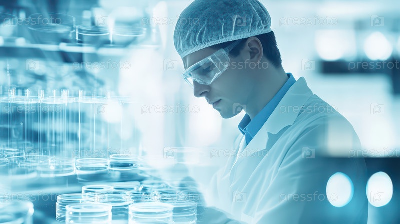 Мужчина-ученый работает с чашками Петри в лаборатории