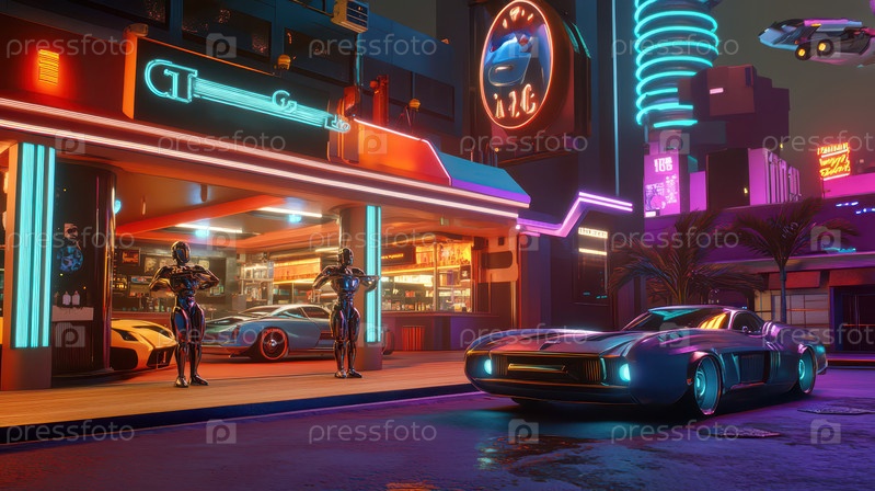 Футуристическая неоновая городская улица с ретро-машинами и роботами
