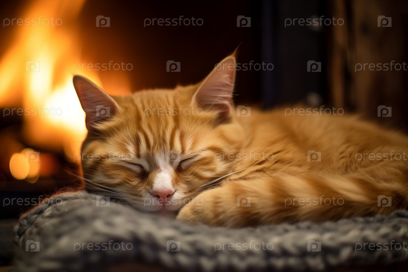 Крупный план кошки, уютно устроившейся на коврике возле потрескивающего камина