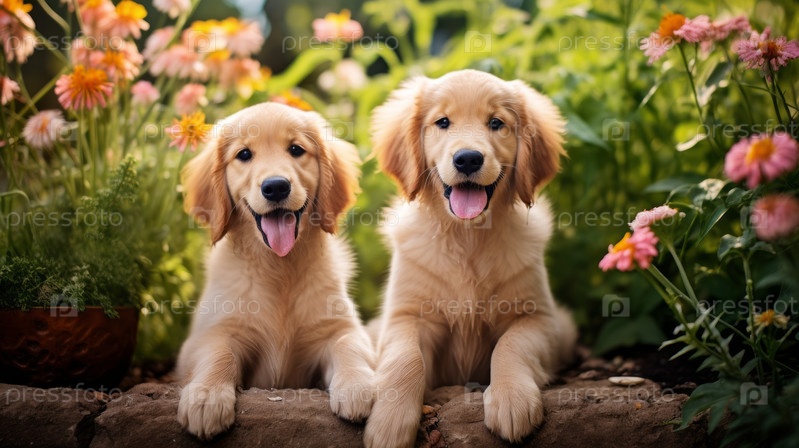 Щенки лабрадора-ретривера сидят среди цветов и зеленой травы