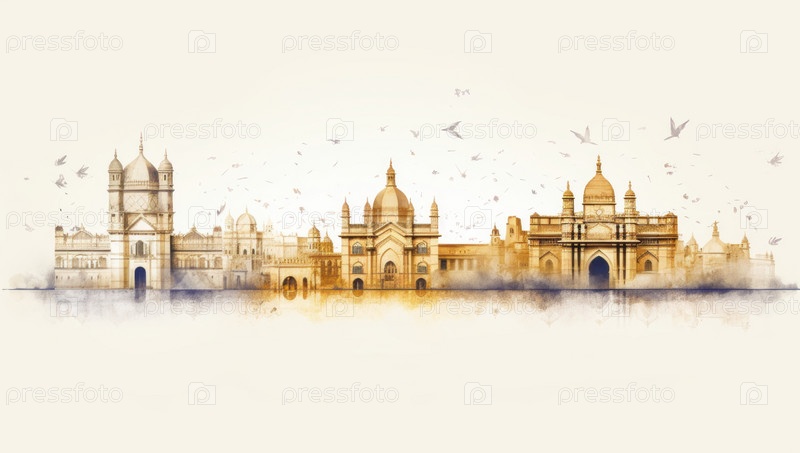 Акварельный всплеск с нарисованным от руки эскизом Ворот Индии Мумбаи, Индия в иллюстрации