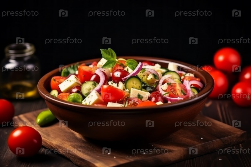 Красочный салат с листьями салата, помидорами, огурцами, морковью и сыром с бутылкой заправки