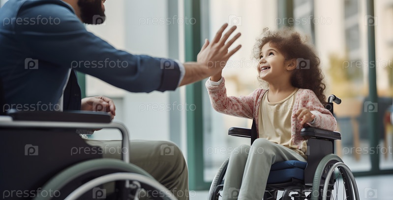 Дружелюбный педиатр дает пять маленькому пациенту в инвалидной коляске. Милая дошкольница в инвалидной коляске приветствует врача в больнице