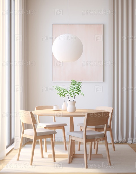 Роскошные апартаменты, комфортабельный люкс, гостиная. Макет постера, круглый стол и стулья в современной столовой