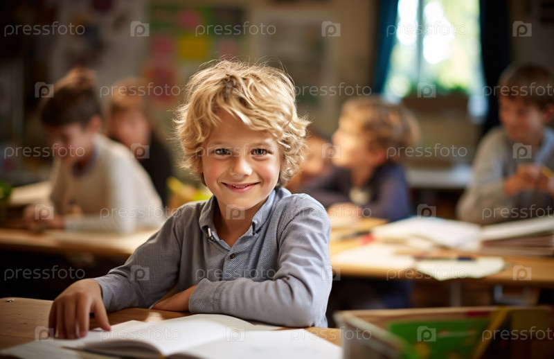 Веселый ребенок улыбается, сидя за партой в оживленном, красочном классе, заполненном другими учениками