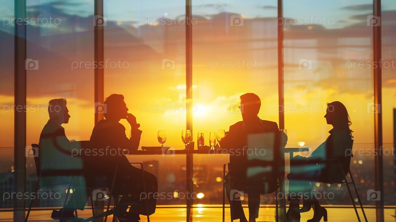 Совместная работа команды в офисе со стеклянными стенами на закате