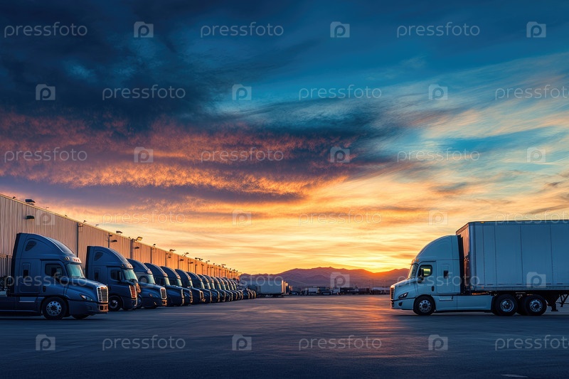 Автопарк белых грузовиков аккуратно припаркован на закате в промышленной зоне