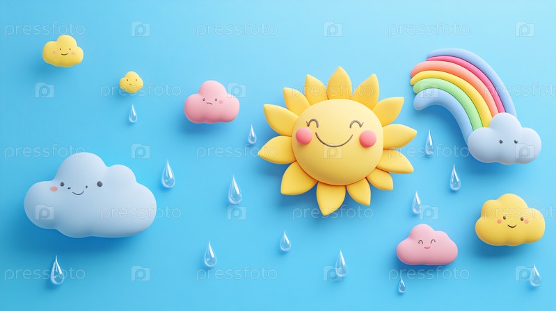 На этой веселой иллюстрации изображены улыбающееся солнце, пушистые облака и яркая радуга