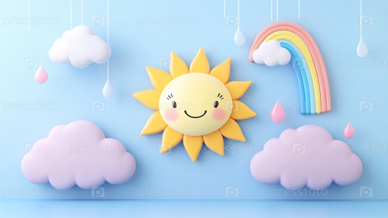 На этой веселой иллюстрации изображены улыбающееся солнце, пушистые облака и яркая радуга
