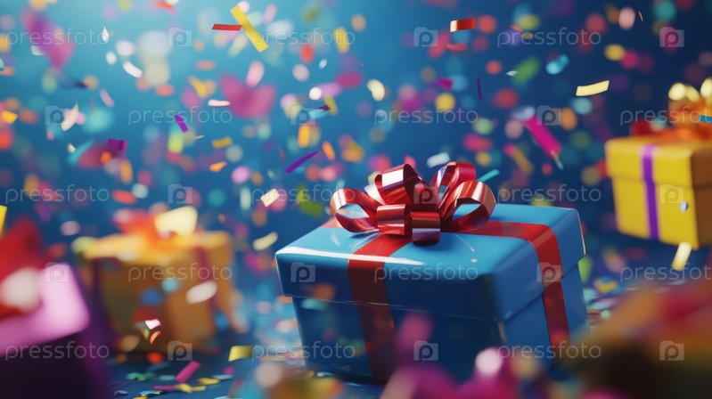 Ярко упакованные подарки среди ярких конфетти и радостных праздников